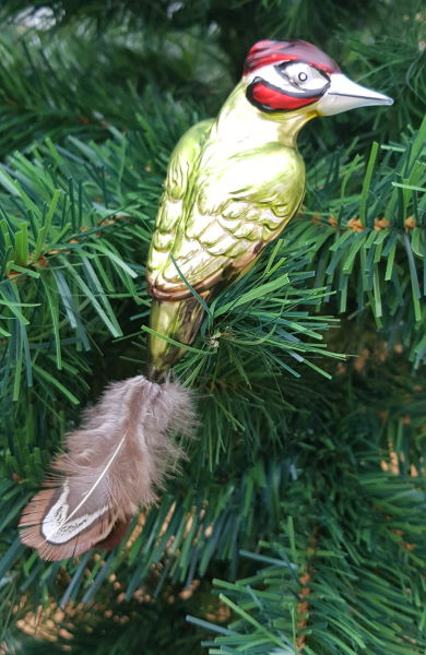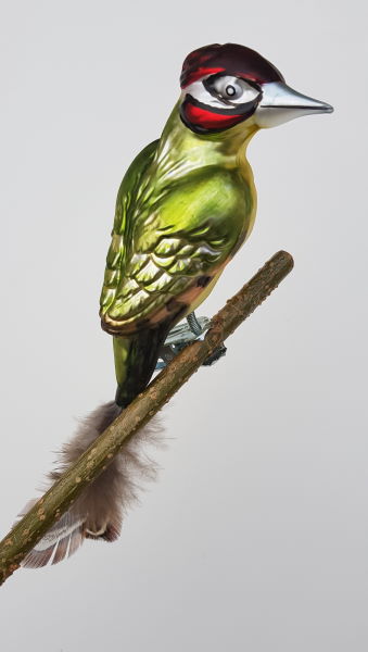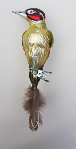 Grünspecht aus Glas mit echter Feder auf Clip ca. 11cm